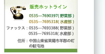 山東魯海食品有限公司が2000年に設立され、山東省莱陽市羊郡鎮に位置しております。工場の直前は青威高速道路があり、青島空港まで60キロ、煙台空港まで80キロで、優越な地理条件を持っております。 会社の登録資金は5000万元です。敷地面積39600㎡があり、1200人の従業員を持ちます。主に冷凍果物、野菜、調理食品、揚げ物及び新鮮、冷凍水産物などを生産しております。年間量は15000MTで、日本、台湾、韓国、欧米と国内20など世界各国に輸出しております。年間輸出量は12000Mtです。 幣社は起立された以来、終始変わらず“品質をもって生存を、信用をもって発展を求める”という経営理念のもとで、ご信頼いただく商品を広大なユーザに提供する同時に国内外の取引先できるように努力しております。国際市場の発展に適応するために、弊社は2001年にISO9001、2000国際品質システム認証を収得し、2003年にHACCP安全衛生管理システム認証も収得しております。魯海は誠意をもって、国内外の友人と業務を商談していけます。お互いに輝かしい業績を成し遂[MORE]